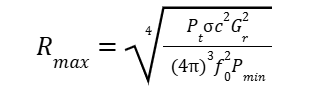 where R_max is the maximum range, Pt is the transmitter's peak power, Gr is the gain of the radar antenna, C is the speed of light, σ represents the radar cross-section, f0 is the radar signal frequency, and Pmin is the minimum detectable signal power at the receiver.