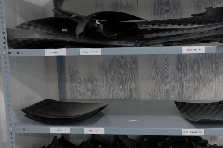 A drone is made up of roughly 18 different carbon fiber parts, including mounts, wings, and winglets. While carbon fiber dominates the build, a bit of Kevlar is used here and there. For example, the nose cone uses Kevlar, as carbon fiber would block radio signals like GPS. Also, Kevlar sandwich panels are used for internal midsection parts as they are easier to laser-cut.