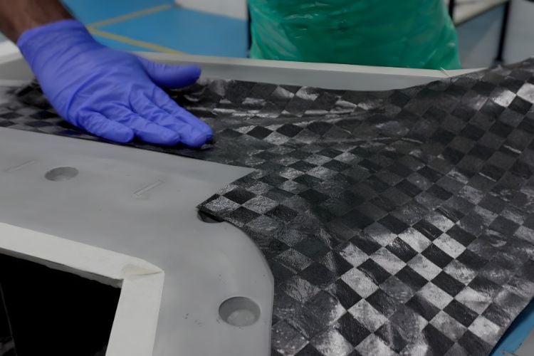 In the preparation area, we saw different types of fabric, fabric being cut, a release agent being applied to the mould to make it easy to separate the fabric from it later, and carbon fiber fabric in pre-preg form (carbon fiber already infused with resin) stored in a refrigerator so it does not cure prematurely. And in the layup area, we witnessed two carbon layers placed on a mould, sandwiching a layer of foam. Naman pointed out that most structures made out of carbon fiber today are just multiple layers of carbon fiber, which is not as efficient as this by far. In the vacuum bagging section of the room, a release film was being applied to prevent the fabric from sticking to the vacuum bagging film. Naman noted that it also doubles in purpose by absorbing a bit of excess resin as well. A breather cloth then goes over that to absorb excess resin, while benefiting from the release film that helps it not stick to the carbon material. A vacuum bagging film goes over the whole setup, it’s sealed tight, and then the excess air is sucked out through vacuum lines. Once vacuum bagged, the consolidation is sent to an oven to cure, which is followed by trimming.
