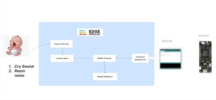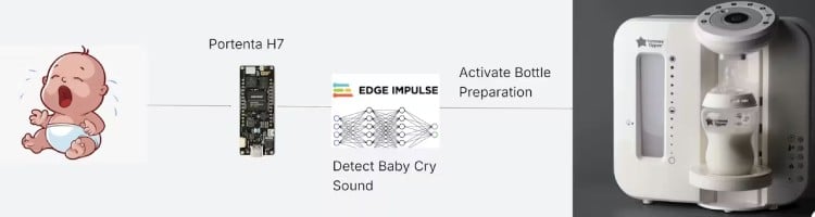 At the hardware level, the implementation remains intentionally minimal. An Arduino Portenta H7 is paired with a DFRobot Gravity relay module, wired in parallel with the start switch of a commercial bottle preparation machine. While the prototype uses a commercial Tommee Tippee unit, the approach can be adapted to any device that relies on a single mechanical button, requiring no permanent modification to the appliance itself. Audio classification is handled entirely on the microcontroller, without any dependence on cloud services or network connectivity. Manivannan trained a lightweight model using Edge Impulse, recording both background room noise and infant crying. Feature extraction is based on MFCCs, a practical choice for sound recognition on constrained hardware, and the model is deployed directly to the Portenta H7 for continuous local inference.