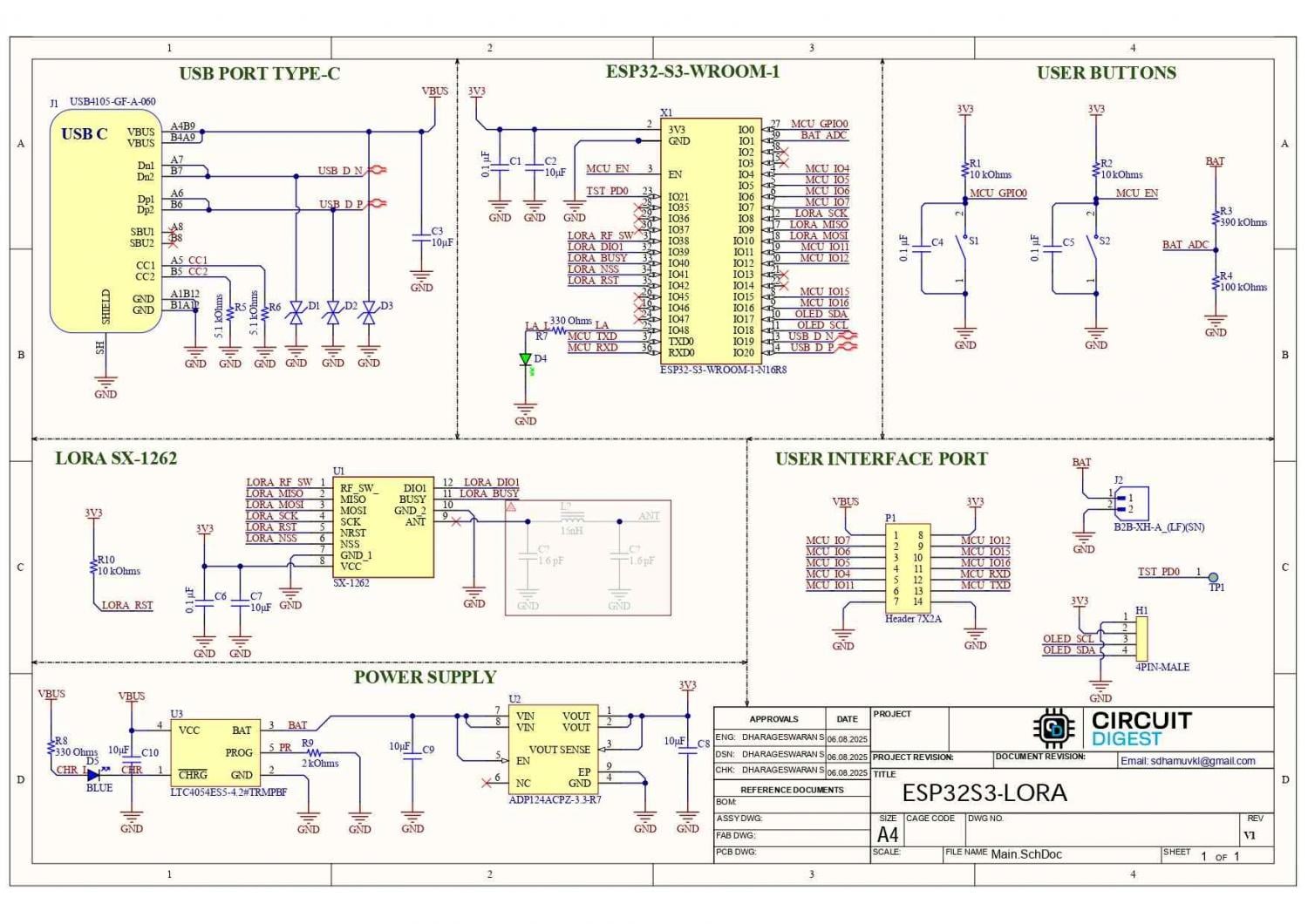The board is built around carefully selected components that balance performance with compactness. At the core is the ESP32-S3-WROOM-1 module, which provides dual-core processing power and wireless connectivity. Alongside it, the Wio SX1262 transceiver delivers long-range LoRa communication. Supporting components include the LTC4054 for battery charging, ADP124 as a low-dropout regulator, and a variety of passive elements such as capacitors and resistors to stabilise the system.