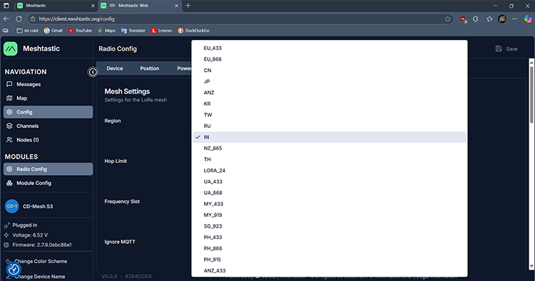 Once everything is loaded in the web client, the first configurations you should set for your Meshtastic LoRa devices include your LoRa region (mine is set to India for this DIY Meshtastic node), node name, channel key (use the same channel key for all the nodes that you want to communicate in your off-grid mesh network), and any other system settings you want to customize. Using the web client ensures all changes are applied immediately to your Meshtastic ESP32 board and provides an easier way to manage your Meshtastic node with ESP32-S3 configuration compared to Bluetooth.