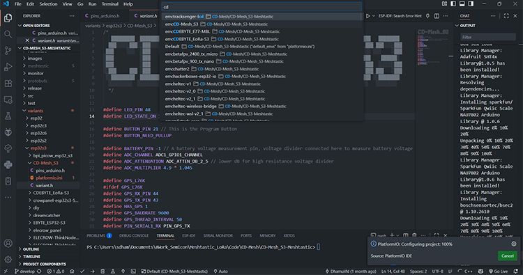 Within PlatformIO, select the project environment named CD-Mesh_S3, which is preconfigured for the ESP32-S3 and SX1262 LoRa module. All necessary Meshtastic DIY ESP32 LoRa pinout settings for this PCB are already included, so you don't need to modify anything for your off-grid mesh network deployment.